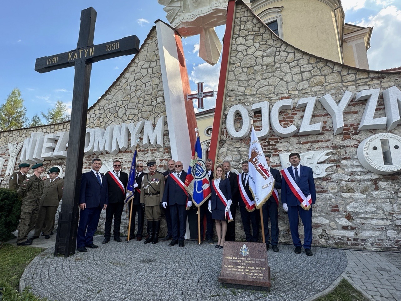 Stoimy przy pomniku „DLA CIEBIE POLSKO” – pamięci tych, co służąc w mundurach oddali życie za drugiego człowieka, ojczyznę i pokój na świecie 1982-2023 >> – jak brzmi napis. Jest warta honorowa Wojska Polskiego. Jest Orkiestra Wojskowa i Kompania reprezentacyjna. Są przemówienia. Krótko Proboszcz, dłużej Wicewojewoda, wspaniale Kurator Oświaty, zwięźle po wojskowemu Dowódca Garnizonu Balice. Przecięcie biało czerwonej wstęgi okalającej pomnik. A potem Apel. Apel Poległych. Apel przypomina naszą historię, naszą walkę o Polskę, nasze zmagania Narodu – by być tu, gdzie dzisiaj jesteśmy. A po nim, po Apelu składanie kwiatów, od mundurowych, od wojewody, od wójta – gospodarza, od Kuratora Oświaty, szkół, harcerzy, Strzelców, coraz więcej kwiatów, od różnych środowisk. A my, „Solidarność” - trochę wcześniej, przy gromadzie fotoreporterów odsłaniamy Replikę Krzyża Wolności i Solidarności, Krzyża teraz patrzącego z góry na przebieg uroczystości „Dla Ciebie Polsko”. Patrzącego z góry jak powinien to robić Krzyż.
